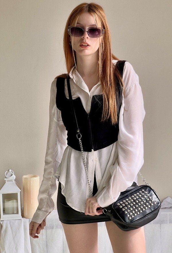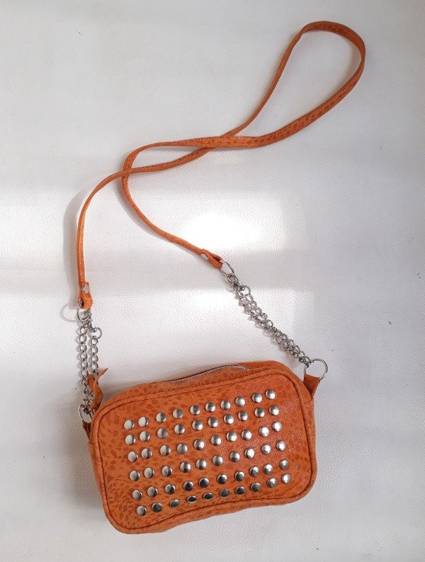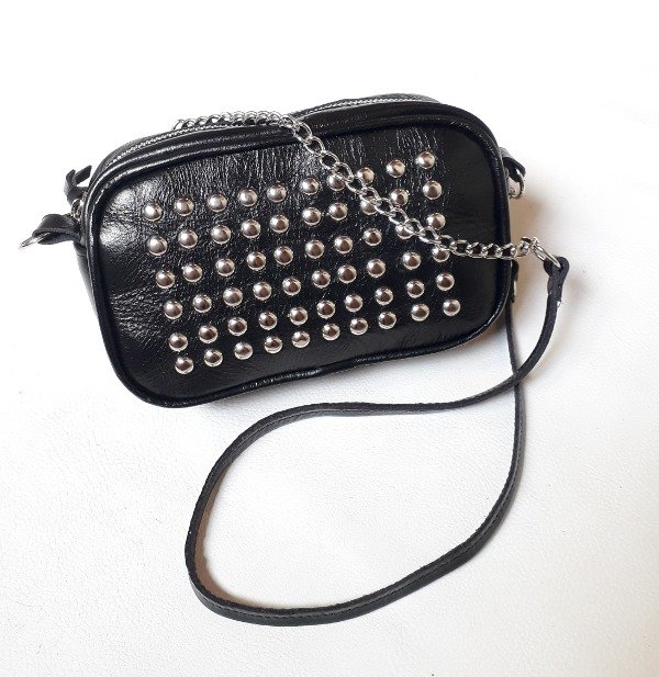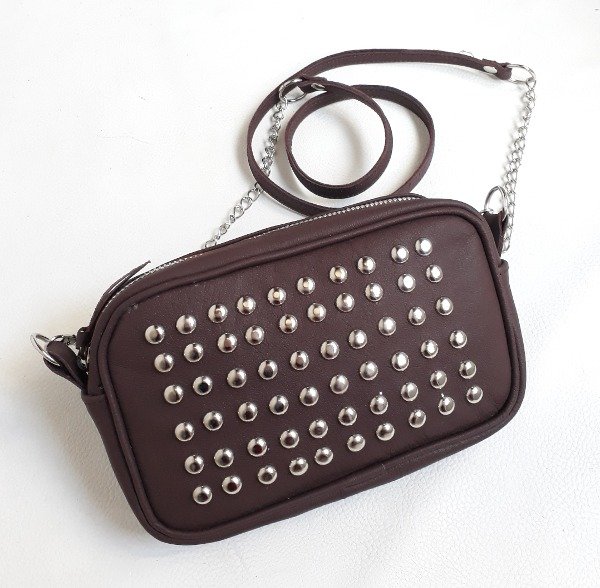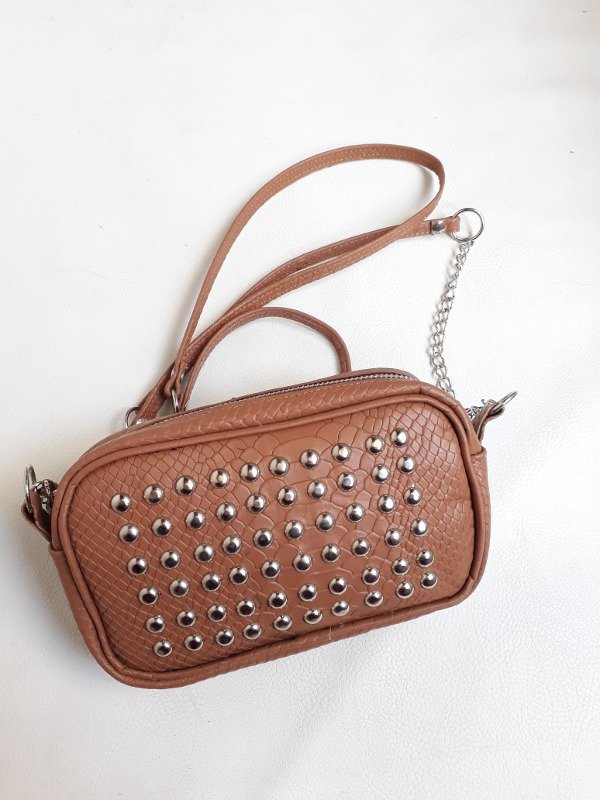 Bandolera en cuero vacuno, forrada en interior, correa regulable y tachas de metal