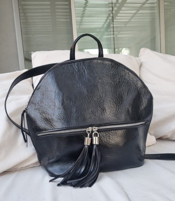 Mochila de cuero forrada y con bolsillo interno. Cierre de metal ykk, bolsillo externo con dos borlas de flecos, correas regulables