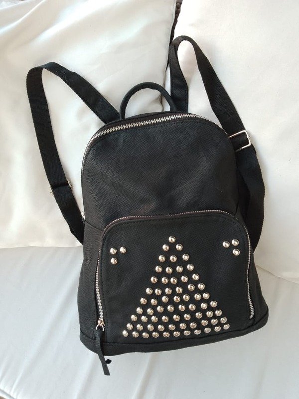 Mochila de cuero, forrada con bolsillo interno, cierre de metal ykk, correas de cuero y cintas regulables. Bolsillo extrno con cierre y apliques de tachas